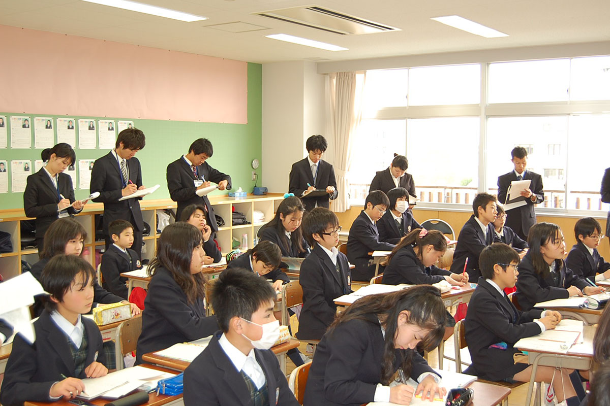 - 教員の仕事は、生徒一人ひとりの成長を見届けられる素敵な職業です。生徒にとって教員は1日の約3分の1の時間を共に過ごす存在です。教員の姿が生徒の人間形成に大きく関わり、やりがいのある職業となっています。