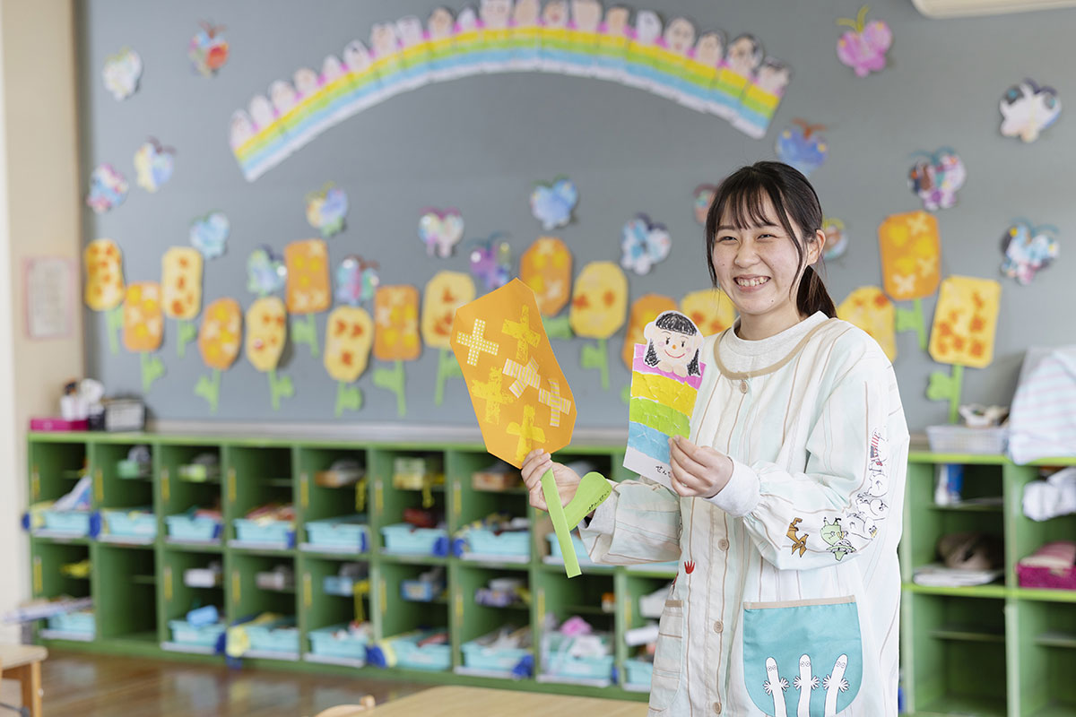 幼稚園では季節や月の行事、運動会、発表会など様々な行事があります。始めた頃は大変でしたが、こどもたちの笑顔と成長する姿はとても励みになります。幼稚園教諭として、それぞれの個性に寄り添い、大切にはぐくみたいと思っています。