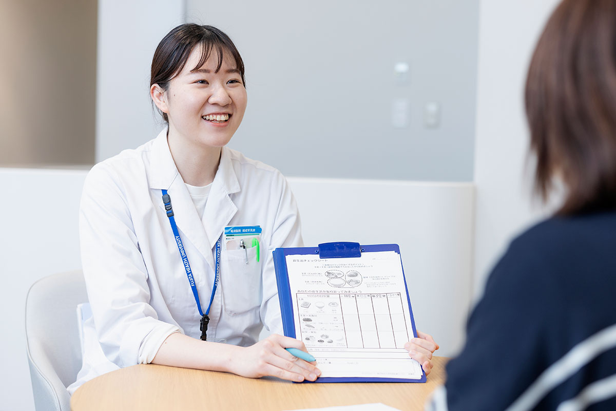 病院の管理栄養士として患者さんへの栄養指導や病院食の献立づくりを行っています。総合病院であるため、患者さんの疾患や症状もさまざま。それぞれの課題に対する提案をしています。また、一人ひとりに合ったアドバイスが重要なため、患者さんの現状を知るためのヒアリングを重視し、寄り添った栄養指導を心がけています。